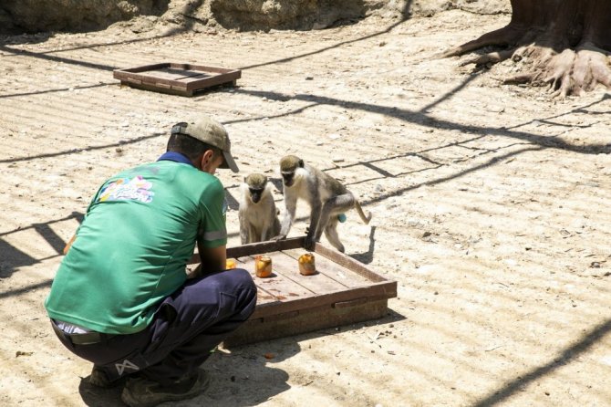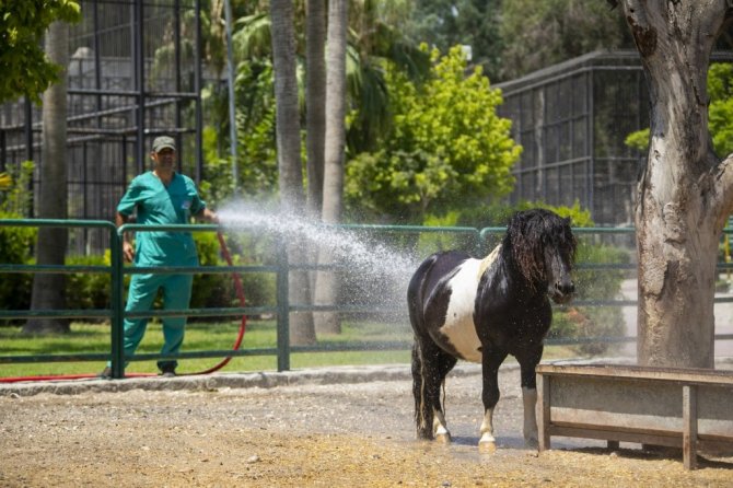 Tarsus Doğa Parkı'nda görevli veteriner hekim Celal Çevirgenoğlu, sıcak havanın etkisini göstermeye başladığını belirterek, "Sıcaklık stresine bağlı olarak hayvanlarımızda beslenme yetersizliği olmasın diyerek bazı tedbirler aldık. Özellikle suyu seven, sudan korkmayan hayvanlarda yağmurlama sistemiyle serinletme uyguluyoruz. Onun haricinde babunlar, lemurlar, ayılar, bu tip meyve sebze ile beslenen hayvanlar için küçük buzlu kokteyller hazırlıyoruz. İçerisinde sevdikleri meyvelerden, sebzelerden oluşan kokteyl oluyor. Yaz sıcaklarını bu şekilde elimine etmeye çalışıyoruz. Onlar da bundan mutlular. Özellikle atlar yıkanmaktan çok hoşlanıyorlar" dedi.