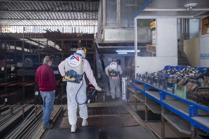 Mersin Büyükşehir Belediyesi, il genelinde vatandaşların ortak kullanım alanlarında dezenfeksiyon işlemlerine devam ediyor. Ekipler, bu kapsamda vatandaşların giriş ve çıkışlarının yoğun olduğu Tarsus Sanayi Sitesi ile esnafın dükkanlarını dezenfekte etti.