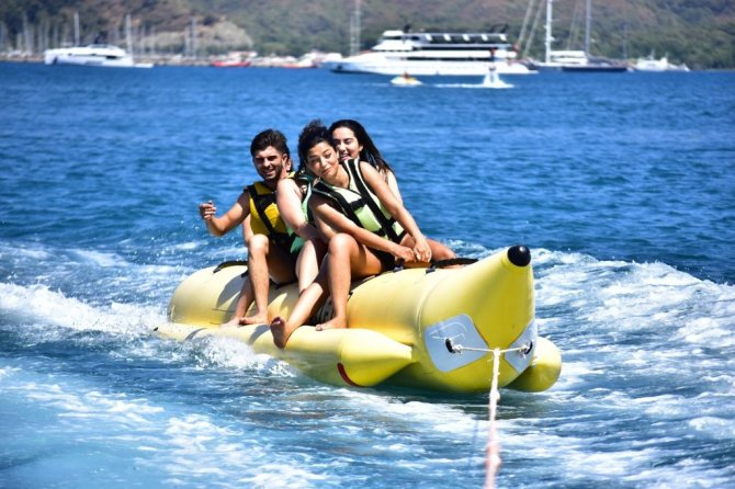 Tekneye bağlanmış paraşüt ile eşsiz Marmaris manzarasını havadan gören tatilciler, jet-ski, banana ve diğer oyunlar ile hem eğlenip hem de anı biriktiriyorlar. Van'dan arkadaşları ile tatile gelen Sergen Değertaş, "Buraya tatile geldik, su sporları çok eğlenceli biz çok eğlendik, heyecanlandık. Buraya gelen herkese tavsiye ediyoruz. Yangınlar ile ilgili gerçekten çok üzüldük doğal güzelliklerimizin yanmasına çok üzüldük" dedi.