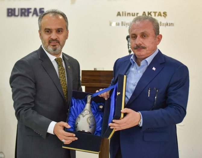 Konuşmaların ardından Başkan Aktaş, günün anısına TBMM Başkanı Şentop'a BUSMEK kursiyeri tarafından yapılan vazo hediye etti.