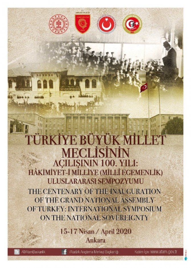 Ankara Valiliği işbirliğinde düzenlenecek olan “Türkiye Büyük Millet Meclisinin Açılışının 100. Yılı: Hâkimiyet-i Milliye (Millî Egemenlik)” konulu uluslararası sempozyum, 15-17 Nisan 2020 tarihleri arasında Ankara’da gerçekleşecek. Sempozyum çerçevesinde milli egemenlik fikrinin ve millet iradesinin en büyük güç olduğu düşüncesinin vurgulanması amaçlanıyor. Söz konusu sempozyum ile hâkimiyetin kayıtsız şartsız millete ait olduğu gerçeğinden hareketle Atatürk Araştırma Merkezi tarafından cumhuriyet ve demokrasinin önemine dikkat çekilecek. Sempozyumun konu başlıkları ise; Siyasal Sistemler, Dünyada ve Türkiye’de Parlamento, Türkiye’de Anayasal Gelişmeler ve Siyasal Partiler, Seçimler ve Demokrasi olacak.