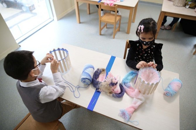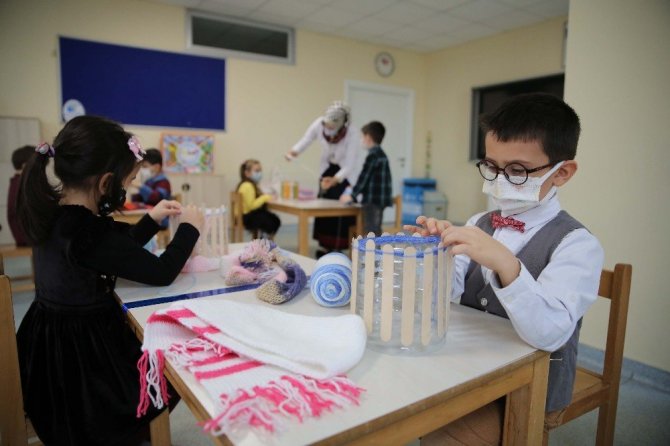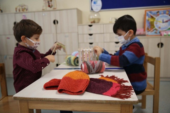 Türkiye Diyanet Vakfı (TDV) Ferda Koleji Anaokulu öğrencileri, İlmek İlmek İyilik Projesi kapsamında Doğu ve Güneydoğu Anadolu bölgelerindeki ihtiyaç sahibi çocuklara ulaştırılmak üzere atkı, anneleri de bere ve eldiven örüyor.
