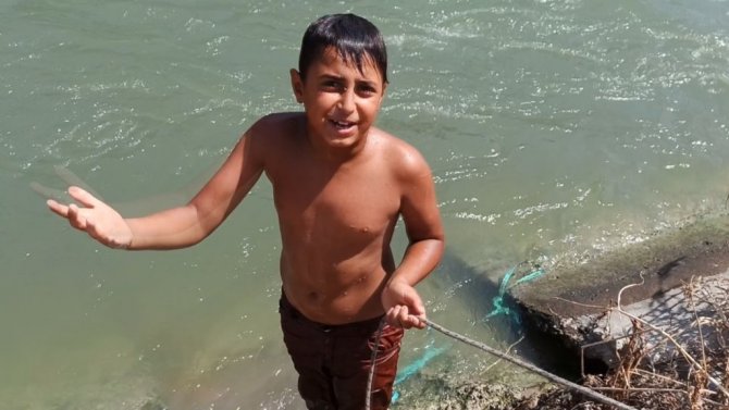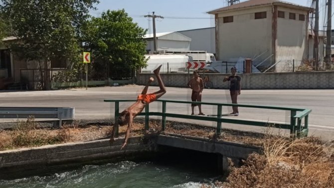 Bursa'nın Mustafakemalpaşa ilçesinde aşırı sıcaklardan bunalan çocuklar, tehlikeli ve yasak olmasına rağmen DSİ'ye ait sulama kanalında yüzerek serinliyor.