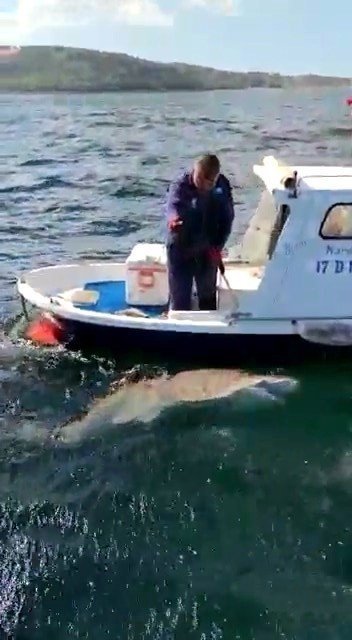 2,5 metrelik camgöz cinsi köpek balığını gören çevredeki diğer amatör balıkçılar o anları cep telefonu ile kayıt altına aldı. Karakaş, köpek balığını tutmak yerine oltanın ucunu keserek denize bıraktı.