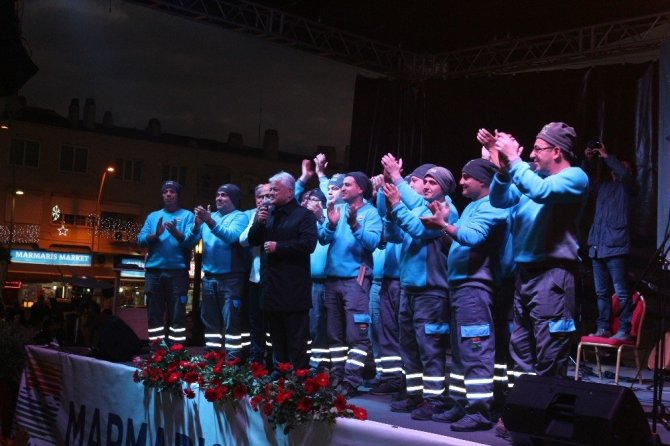 Marmaris Yeni Yıl Festivali kapsamında Marmaris Belediyesi Temizlik İşleri Müdürlüğü çalışanları sahne aldı. Temizlik işçileri, 19 Mayıs Gençlik Meydanı’nda kurulan sahnede hem müzik enstrümanı çaldı hem de şarkı söyledi. Profesyonel müzisyenleri aratmayan temizlik işçilerinin gösterisine Marmarisliler yoğun ilgi gösterdi. Çalışanlar sahne performanslarından sonra ateş etrafında hep birlikte dans etti. Çalışanları Marmaris Belediye Başkanı Ali Acar da yalnız bırakmadı. Acar etkinlik hakkında konuştu. Belediye çalışanlarıyla gurur duyduğunu belirten Acar, “Biz temizlik konusunda örnek bir kentiz. Bu başarıyı çalışan personelimizle elde ediyoruz. Onların sadece temizlik konusunda değil, daha neler yapabileceklerinin bir görüntüsüydü bu. Marmaris yaşayanımız ekibimizin kendi çabalarıyla yaptığı bu şova bugüne kadar yapılan bütün şovlardan daha çok beğeni aldığını görüyorum. Mesai arkadaşlarımı ve kardeşlerimi bu güzel şovlarından dolayı kutluyorum" dedi.