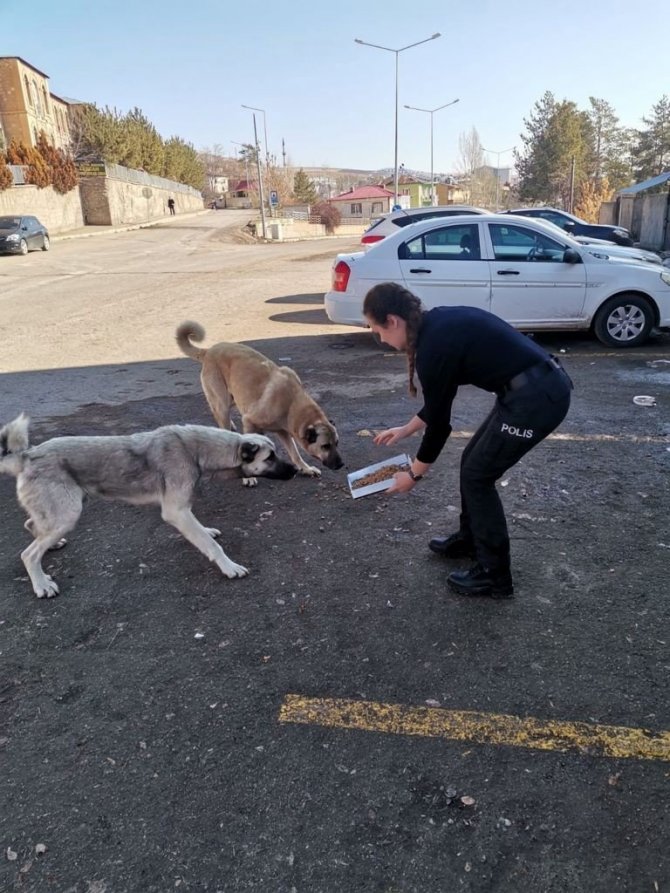 İlçede sokak hayvanlarının aç ve susuz kalmaması için çalışma yapan polisler kendi imkânlarıyla aldıkları mamalarla hayvanları beslediler.