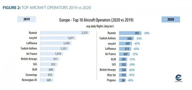 EUROCONTROL verilerinde Avrupalı havayolu şirketlerine ilişkin uçuş rakamlarına da yer verildi. Salgın öncesi 2019 yılında günlük ortalama bin 331 uçuşla Avrupa'da 4'üncü sırada yer alan Türk Hava Yolları(THY), küresel havacılık sektörünü büyük oranda etkileyen pandemi nedeniyle büyük düşüş yaşanmasına rağmen 2020'de günlük ortalama 626 uçuşla İrlanda merkezli Ryanair'in ardından en fazla uçan ikinci havayolu şirketi oldu. Yine Pegasus Havayolları da ortalama 261 uçula listeye 10'uncu sıradan girdi.