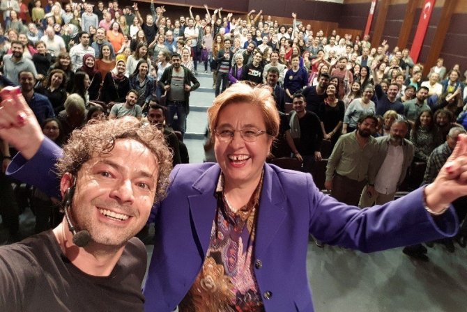 Oyun sonunda Başkan Pekdaş’ı sahneye davet eden Değirmenci, Tiyatro Konak’ta projesinden ve bu kapsamda Selahattin Akçiçek Kültür Merkezinin görkemi bir tiyatro sahnesine çevrilmesinden ötürü teşekkür etti. Tiyatro Konak’ta projesinin açılışına gösterilen ilgiden duyduğu mutluluğu da dile getiren Pekdaş, tüm İzmirlileri aralık ayı sonuna kadar devam edecek tiyatro gösterilerine davet etti. Konuşmaların ardından Değirmenci, tüm davetlilerle birlikte sözlerini değiştirdiği ‘Tanrım’ şarkısı eşliğinde dans etti.