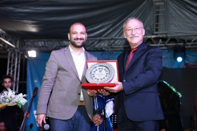 Tiyatrocu Altan Erkekli’ye dinletisi sonunda plaket ve çiçeğini Fatsa Belediye Başkan Yardımcısı İbrahim Eroğlu takdim etti.