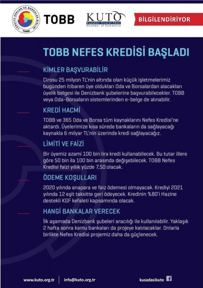 Kuşadası Ticaret Odası üyeleri, Ticaret Odası’ndan alınacak “Nefes Kredisi Başvurusu İçindir” ibareli faaliyet belgesi ile banka şubelerine başvurulabilecekler. Üyeler, başvuruda kullanılacak olan ücretsiz faaliyet belgelerini https://kuto.org.tr/ adresinden e-belge modülünden giriş yaparak da temin edebilirler, ya da kredi başvurusu sırasında banka personeli aracılığıyla KUTO’dan mail yoluyla isteyebilirler. Çalışma saatleri 09:00-17:00 olarak düzenlenen TOBB Nefes Kredisine, Kredi Garanti Fonu (KGF) Hazine desteğiyle kefil olacak.
