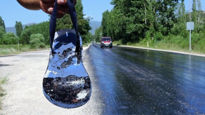 Bölge sakinlerinden Muharrem Cem, yolun karşısına geçmek isterken eriyen asfalta terliği yapıştığını belirterek, "Yoldan geçerken terlik asfalta yapıştı, yolun ortasında kaldım. Neyse ki araç gelmiyordu. Terlik koptu, yolda kaldım. Asfaltın erimesi trafik açısından tehlike oluşturuyor" dedi.