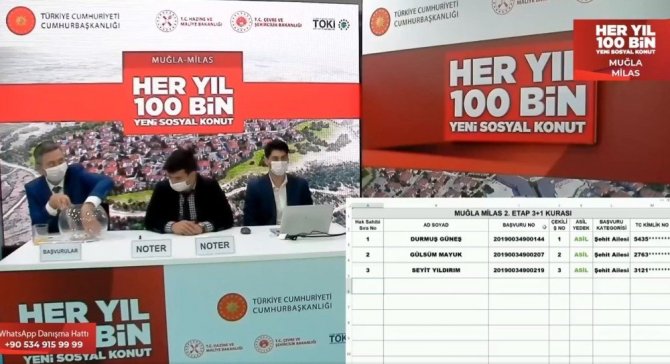 Milas’ta ikinci etap toplu konut projesinin kura çekimleri korona virüs nedeniyle seyircisiz olarak Ankara 15. Noter huzurunda yapıldı. Yüzünde 10’u şehit aileleri, yüzde 5’i ise engelliler için ayrılan konutların kura çekimi TOKİ resmi sosyal medya hesaplarından canlı olarak yayınlandı.
