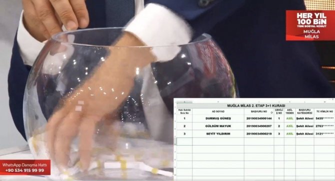 Şehit aile sayısı kontenjan sayısından az olduğu için başvuru yapan 3 şehit ailesi yine direk hak sahibi sayıldı. 55 engelli vatandaş arasından ise ilk önce 5 kişinin kura çekimi yapıldı. Geri kalan 50 kişinin ismi ise yine ikinci bir hak tanınarak diğer başvuruların arasına karıştırıldı. 82 hak sahibi yapılan kura çekimi ile belirlendi.