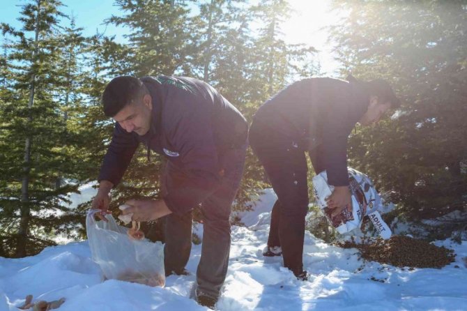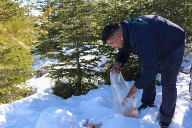 Mersin'in Erdemli ilçe Belediyesi, kış aylarının zorlu geçtiği Toros dağlarında, doğal hayatı destekleme çalışmaları kapsamında yabani hayvanların aç kalmaması için doğaya yem bırakıyor.