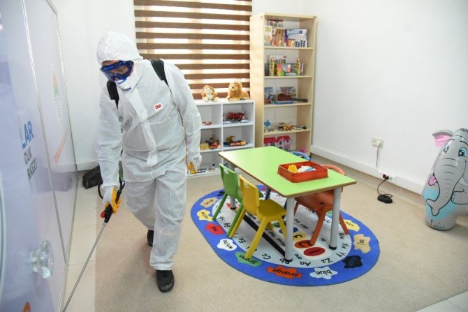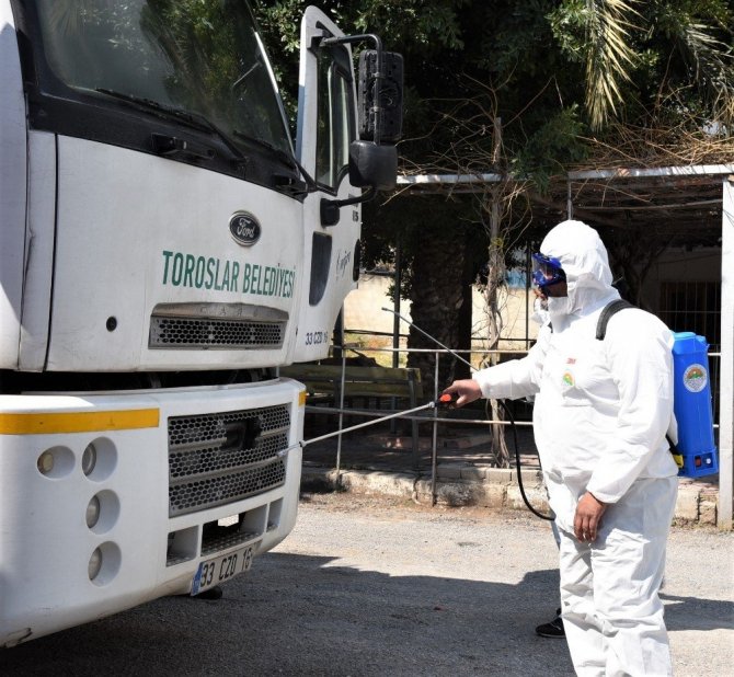 Toroslar Belediyesinden yapılan açıklamaya göre, ilçe genelinde ortak kullanım alanları olan kamu kurum ve kuruluşları, ibadethaneler, işyerleri, sağlık merkezleri ve eczanelerde dezenfekte çalışmalarını periyodik olarak yürüten Temizlik İşleri Müdürlüğü ekipleri, belediyenin çöp kamyonlarını ve banka ATM'lerini de titizlikle dezenfekte ediyor. Hijyen çalışmaları kapsamında çöp konteynerleri de düzenli olarak yıkanıyor. Ekipler, ilçeyi karış karış gezerek dezenfekte edilmedik yer bırakmıyor.