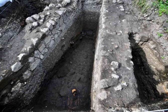 Roma dönemine ait olduğu değerlendirilen 2 basit kiremit mezar bulunduğuna işaret eden Yavuz, "İçkalenin batısıyla ilgili çalışmalarda orada 2 açmada çalıştık. Her iki açmada 2,50 metre derinliğe ulaştık. İlk açma içerisinde yüzeye yakın 2 farklı duvar tespit edildi. Genişliği yaklaşık 1 metreye yakın vaziyette ama derinliği olmayan. Bunların Osmanlı döneminde belki askeri maksatla yapılmış olduğunu düşünüyoruz. Şimdilik o duvarlara dokunmadık fakat aradaki mesafeyi indirmeye çalıştık. Her iki taraftarda yaptığımız incelemelerde farklı dönemlere ait çok miktarda ve çok nitelikli sıralı sırasız tek renkli çok renkli seramik malzeme, amforalar, pitoslar, çatı kiremit parçaları elde ettik. Aynı yerde bir yangın lokasyonu tespit ettik. Tunç şamdan kaidesi bulduk. Muhtemelen balıkçılık için kullanılan malzemeler ele geçti aynı bölgede. Onun dışında o bölgede belki ilginç olacak obsidyen parça kesici alet diyeceğimiz bir parça ele geçti. Aynı bölgede 2 insan iskeleti tespit ettik. Bunlardan doğuda olanı bel hizasına kadar açıldı ve üzerinde bol miktarda kırık olmakla birlikte kiremit parçası bulduk. Bu mezar tipinin basit bir kiremit mezar tipinde Roma mezarı olduğunu düşünüyoruz" diye konuştu.