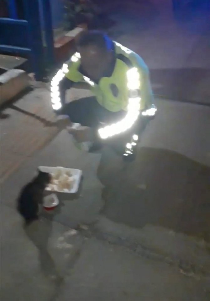 Trafik polisi sahipsiz hayvanları kendi elleriyle besliyor