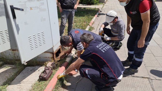 Karabük'te kent meydanında bulunan elektrik trafosuna alt kısmına girerek mahsur kalan yavru kedi, itfaiye ekiplerinin uzun uğraşları sonucu oksijen tüpü sayesinde kurtarıldı.