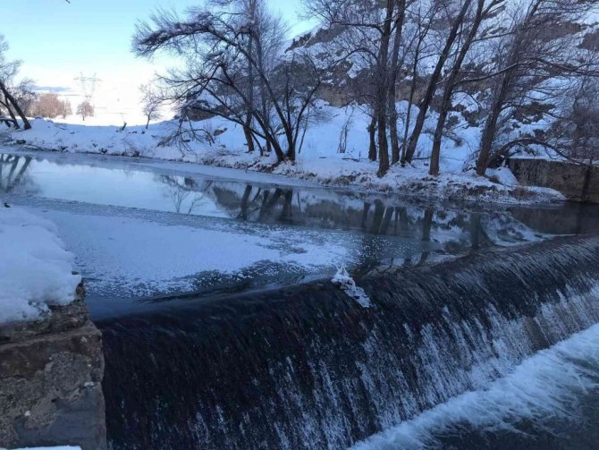 Tufanbeyli'de 4 gün aralıksız yağan karın ardından soğuk hava etkili olmaya başladı. Hava sıcaklığının eksi 25 dereceye kadar düştüğü ilçede göllerin yanı sıra Göksu Irmağı da buz tuttu. Irmağın üzerinde buz tabakası oluşurken, altından su akmaya devam etti.