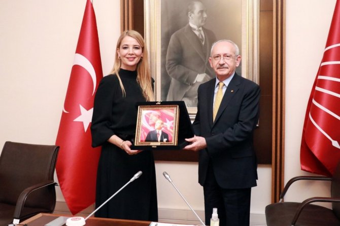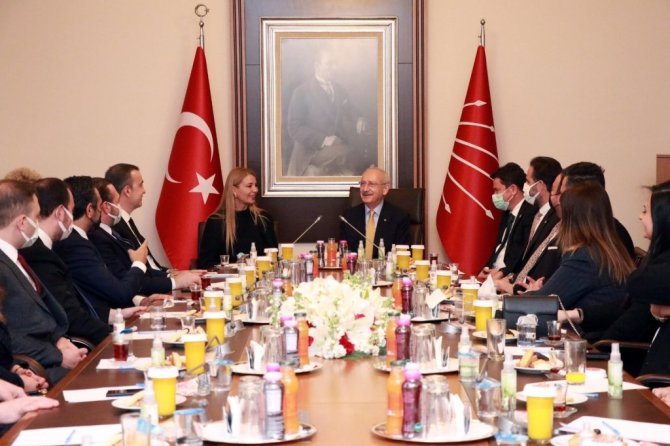 Heyet, Anıtkabir'in ardından Cumhuriyet Halk Partisi Genel Başkanı Kemal Kılıçdaroğlu makamında ziyaret etti. CHP Genel Başkanı Kemal Kılıçdaroğlu'na TÜGİAD çalışmaları ve projeleri hakkında bilgiler veren Nilüfer Çevikel, yeni dönemde Avrupa Yeşil Mutabakatı ve dijital dönüşüm konularına odaklanacaklarının altını çizdi. Cumhuriyet kadını olarak, TÜGİAD tarihinin ilk kadın genel başkanı olmanın sorumluluğunu taşıdığını kaydeden Çevikel, "TÜGİAD olarak amacımız, Türk girişimcisinin sesinin Türkiye'de ve dünyada sesini daha gür çıkması. Ulusal ve uluslararası arenada genç girişimcilerin daha güçlü olması adına lobi oluşturmak ve üyelerimizin vizyonunu geliştirerek, onlara dünyanın kapılarını aralamak. Dünyada iş yapış şekilleri çok hızlı değişiyor. Bu hıza ayak uydurmak ve üyelerimizi geleceğe hazırlamak adına her türlü imkanımızı seferber edeceğiz. TÜGİAD'ın en çok yatırım yaptığı ve uğruna bütün dünyayı dolaştığı en kritik konulardan biri dijital dönüşüm teknoloji. Teknoloji üretmek, genç beyinlerin işidir. Biz üyelerimizle bu alanda da çok başarılı işlere imza atacağımıza inanıyorum. Avrupa Yeşil Mutabakatı ve iklim değişikliği ile mücadele konusunda da duyarlılığı arttırmayı, üretim yapan sanayicilerimizi bu anlamda bilinçlendirmeyi çok önemsiyoruz" dedi.