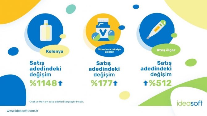 IdeaSoft’un koranavirüsün e-ticarete ve tüketim alışkanlıklarına etkisini incelediği raporda Mart ayında internetten satın alınan dezenfektan, maske, kolonya, eldiven ve ıslak mendil olmak üzere hijyen ürünleri sayısı 6,5 kat arttı. Adet bazındaki yüzde 5.413’lük rekor artışla ilk sırada yer alan dezenfektan ürünlerini yüzde 3.224 artışla maske, yüzde 1.148’le kolonya, yüzde 512’yle ateş ölçer ve yüzde 286’yla eldiven çeşitleri takip etti. Bağışıklık sistemini güçlendirmek isteyenler ise vitamin ve takviye gıdalara yöneldi. Ocak ayına kıyasla bu kategoride satılan toplam ürün adedi Mart ayında yüzde 177 arttı.
