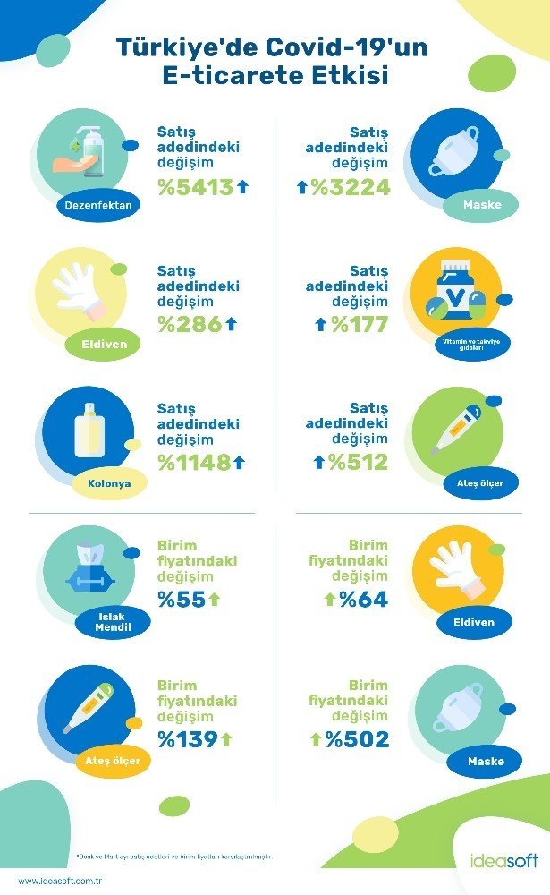 Koronavirüs salgınına karşın alınan tedbirlerin ardından fiziki temas gerektiren tüm faaliyetler azalırken tüketiciler, temassız ticaret olarak adlandırılan e-ticaret sitelerine yöneldi. Özellikle online alışverişlerde sepetlerin içeriği hızla değişti. Türkiye’nin lider e- ticaret altyapı sağlayıcısı IdeaSoft, Mart ayıyla birlikte online ticaret alışkanlıklarındaki değişimi ortaya koymak adına 8.000’den fazla e-ticaret sitesinin siparişlerini inceleyerek Ocak ayıyla kıyasladı. Virüsten korunmanın yollarını arayan vatandaşların yoğun ilgisiyle dezenfektan satışları yüzde 5.413 artış gösterdi. Yoğun talep, fiyatları da etkiledi; Mart ayında maske fiyatları ortalama yüzde 520, ateş ölçer fiyatları ise yüzde 139 arttı.