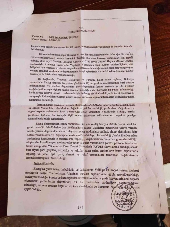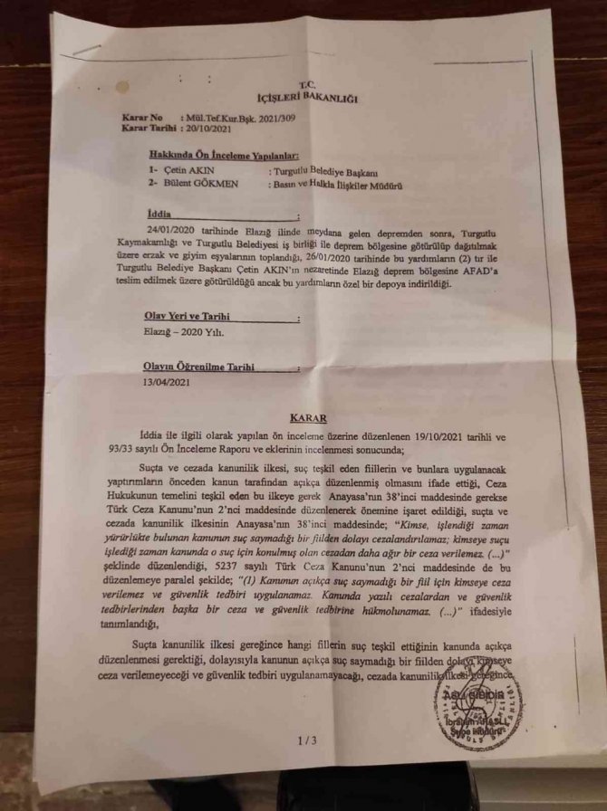 "Elazığ'da 24.01.2020 tarihinde bir deprem olmuştu. Biz de Turgutlu halkı, Turgutlu Belediyesi ve Turgutlu Kaymakamlığı olarak katkı sunmak için yardım kampanyası başlatmıştık. Ama yardım kampanyasından sonra uzunca bir süre Turgutlu gündemini maalesef siyasi parti ilçe başkanları ve buradaki meclis üyelerimiz çok ciddi bir şekilde dillendirdiler. Bunun sonrasında soruşturmalar açıldı ama en son bugün elimize bir belge geçti. İçişleri Bakanımızın imzası ile gelen belgeyi bütün kamuoyuyla paylaşıyorum. Bu konuda Turgutlu Belediyesinin ve benim hakkımı yiyen, bize haksız yere iftira atan herkes ile ben helalleşmek istiyorum ama helalleşir miyim bilmiyorum. Çünkü biz gerçekten zor durumda olan insanlara katkıda bulunmak için bütün Turgutlu halkı olarak bir emek harcadık. Açıklanan nedenlerle "24.01.2020 tarihinde Elazığ ilinde meydana gelen depremden sonra Turgutlu Kaymakamlığı ve Turgutlu Belediyesi işbirliğiyle deprem bölgesine götürülüp dağıtılmak üzere erzak ve giyim eşyalarının toplandığı, 26.01.2020 tarihinde bu yardımların 2 tır ile Turgutlu Belediye Başkanı Çetin Akın'ın nezaretinde Elazığ deprem bölgesine AFAD'a teslim edilmek üzere götürüldüğü ancak bu yardımların özel bir depoya indirildiği" savları ile ilgili olarak bahsi geçen eyleme dair iş ve işlemlerin gerçekleştirerek görevi kötüye kullandığı iddiasına konu olan Turgutlu Belediye Başkanı Çetin Akın'ın yaptıkları fiilin hukuka uygun olduğu, herhangi bir kamu zararının mevcut olmadığı, yaşanan deprem sonrasında meydana gelen yoğunluk, kalabalık ve kaos ortamı da dikkate alındığında; yardım malzemelerinin özel depoya indirilip oradan dağıtılmasının görevi kötüye kullanmak kapsamında değerlendirilemeyeceği anlaşıldığından Turgutlu Belediye Başkanı Çetin Akın hakkında soruşturma izni verilmemesine karar verilmiştir."