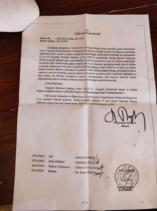 Turgutlu Belediye Başkanı Çetin Akın, 24 Ocak 2020 tarihinde Elazığ'da meydana gelen depremin ardından Turgutlu Belediyesi ve Turgutlu Kaymakamlığı işbirliğiyle gerçekleştirilen yardım kampanyasında toplanan gıda ve eşya malzemelerinin yerine ulaştırılmadığı iddiasıyla yapılan suç duyurusu hakkında İçişleri Bakanı Süleyman Soylu'nun imzasıyla soruşturma izni verilmemesi kararını kamuoyuyla paylaştı.
