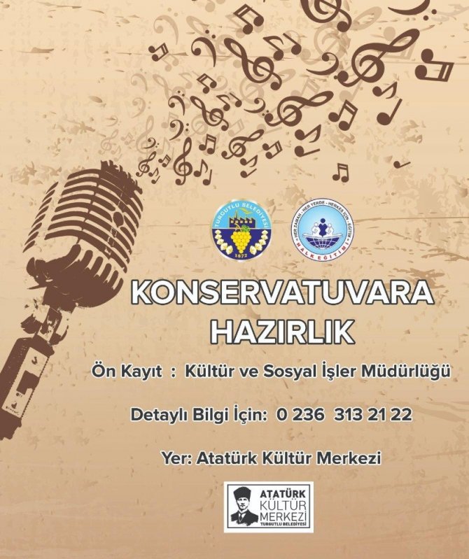 Turgutlu Belediyesi ve Halk Eğitim Müdürlüğü iş birliği ile 10-14 yaş arasında çocukların kayıt olabileceği müzik okulu açılıyor. Müzik okulunda, şan, nota ve enstrüman eğitimleri verilecek. Hayata geçirilecek bir diğer kurs da ise konservatuvara hazırlanan öğrencilere eğitim desteği verilecek.