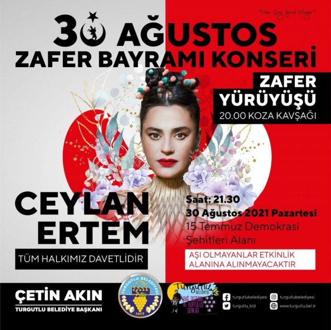 Turgutlu Belediye Başkanı Çetin Akın'ın göreve gelmesiyle birlikte yeniden düzenlenen Zafer Bayramı, Bağ Bozumu ve Kurtuluş Şenlikleri, 30 Ağustos Pazartesi günü Zafer Yürüyüşü ve Ceylan Ertem konseriyle başlayacak. Koza Kavşağı'nda saat 20.00'de başlayacak olan yürüyüş, 15 Temmuz Demokrasi Şehitleri Alanı'nda son bulacak. Saat 21.30'da ise ünlü müzisyen Ceylan Ertem'in vereceği konser ile her yaştan Turgutlulu 30 Ağustos Zafer Bayramı coşkusunu doyasıya yaşayacak.