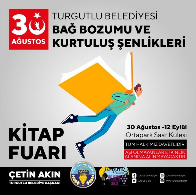 Zafer Bayramı, Bağ Bozumu ve Kurtuluş Şenlikleri kapsamında 30 Ağustos'ta başlayıp 12 Eylül Pazar günü son bulacak olan Kitap Fuarı da Orta Park Saat Kulesinde kitap severleri ağırlayacak.
