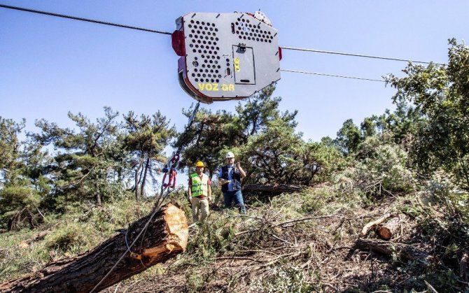 Manisa’nın Turgutlu ilçesinde ormanların bakımı ve gençleştirmesi çalışmalarında orman ürünlerini ormandan çıkarmak için havai hat sistemi kuruldu. Üretim işlerinde çalışanlara kolaylık sağlayan ve orman emvalinin taşınması esnasında orman toprağı ve genç fidanlara zarar vermeden çalışma imkanı sunan havai hat, iş gücü ve zamandan da büyük oranda tasarruf sağlıyor.