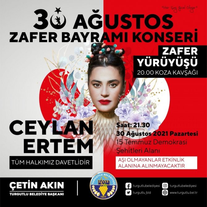 "30 Ağustos: Saat 20.00 Koza Kavşağı Zafer Korteji, Saat 21.30 Ceylan Ertem Konseri (15 Temmuz Demokrasi Şehitleri Alanı).