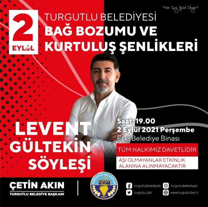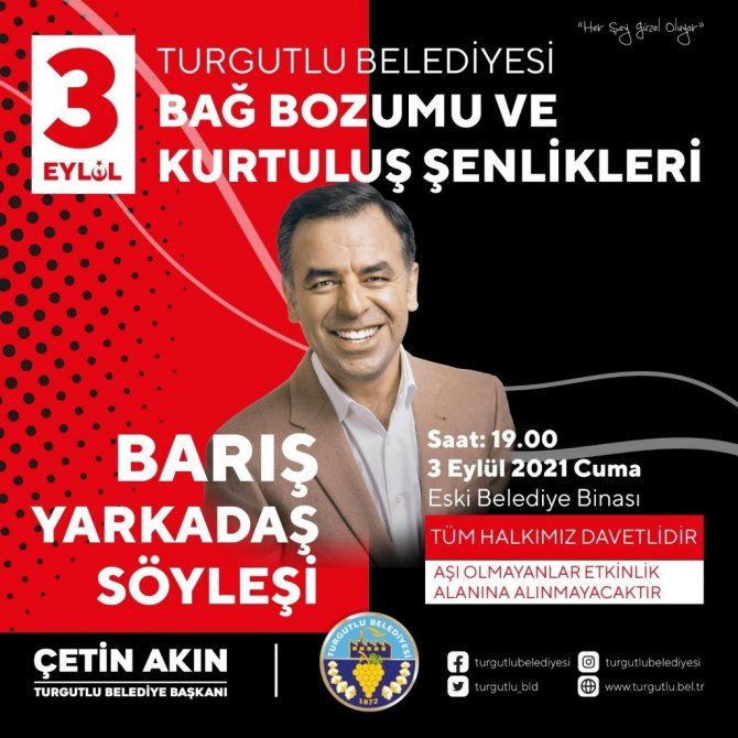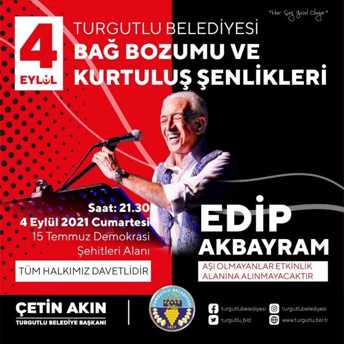 Turgutlu Belediye Başkanı Çetin Akın, "Geçtiğimiz yıl pandemi sebebiyle gerçekleştiremediğimiz Bağ Bozumu ve Kurtuluş Şenlikleri'nin coşkusunu bu yıl yeniden yaşayacağız. Hem Zafer Bayramımız hem de Turgutlu'muzun kurtuluşunun yıl dönümünü kutlayacağımız şenlikler için dopdolu bir program hazırladık. Tüm hemşehrilerimizin pandemi, yangın ve sel felaketleri başta olmak üzere yaşadığımız zor günleri bir nebze de olsa geride bırakıp keyifli, eğlenceli ve mutlu anlar yaşayacakları şenliğimize katılmaya davet ediyorum" dedi.