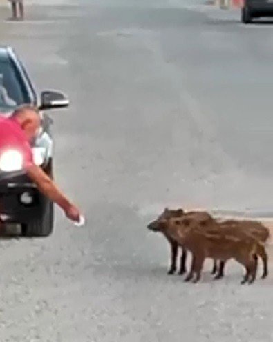 Aydın'ın Didim ilçesine bağlı Akbük Mahallesi'nde yaban domuzu sürüleri ormanlık alandan merkeze inerek yiyecek ararken, evlerin arasında gezen domuz sürüsü, vatandaşlar tarafından beslendi.