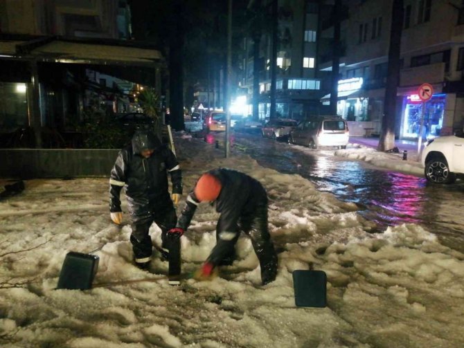 Muğla'da geçen temmuz ve ağustos aylarında yaklaşık 60 bin hektar alanın orman yangınlarında zarar gördüğü, bir ay önce de selin meydana geldiği Marmaris ilçesine fındık büyüklüğünde dolu yağdı.