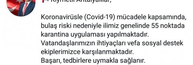 Vali Ersin Yazıcı, sosyal medya hesaplarından yaptığı açıklamada, "Kıymetli Antalyalılar, korona virüsle mücadele kapsamında, bulaş riski nedeniyle ilimiz genelinde 55 noktada karantina uygulaması yapılmaktadır. Vatandaşlarımızın ihtiyaçları vefa sosyal destek ekiplerimizce karşılanmaktadır. Başarı, tedbirlere uymakla sağlanır" ifadelerine yer verdi.
