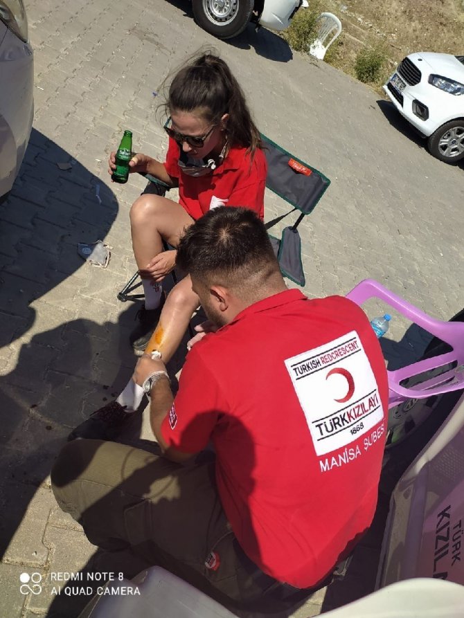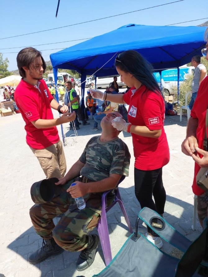 Türk Kızılay Manisa Şubesi İlk Yardım Eğitim Merkezi Mesul Müdürü Özlem Baran ise yangın bölgesine ekibiyle birlikte geçerek orman yangınlarına müdahale eden orman, itfaiye ekipleri, askerler, çeşitli sivil toplum kuruluşları görevlileri ve gönüllülerine ilk yardım uyguladıklarını ifade etti. Baran, "Genelde düşmeye bağlı yaralanma, yanık, gözde yabancı cisim, alandaki yoğun kül yağmurundan kaynaklı ileri derecede göz hassasiyeti, uzun süreli çalışmadan kaynaklı şeker düşüklüğü, kazma kürekle çalışmaktan kaynaklı ele kıymık batması, haşerelerden kaynaklı alerjik reaksiyon gibi durumlar için ilk yardım uygulamalarımızı yaptık. Ekibimiz olarak ilk yardım bilgimiz ve deneyimimizle birlikte tüm afetlerde görev almaya hazırız" diye konuştu.