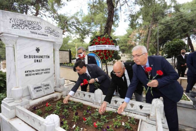 Dr. Burhanettin Onat'ın Antalya'nın efsane belediye başkanlarından olduğunu hatırlatan Tütüncü, "Türk ocağının kurucusu, kırmızı şeritli İstiklal Madalyası sahibi kahramanımız, aynı zamanda Antalya'nın kudretli milletvekillerinden, 1950 ile 60 yılları arasında Antalya'nın dünya sahnesine çıkmaya hazırlandığı vakitlerde Antalya'ya çok büyük yatırımları getirmeyi başarmış, bu güzel şehrin insanlarına iş, aş ekmek olacak önemli sanayi yatırımlarına tesislere dönüştürmüş ve bu yanıyla bu yönüyle de memleketimize çok büyük hizmetleri olmuş kocaman bir kahramanımız. Antalyaspor'a bakın, Antalya'nın stadyumu'na bakın Dr. Burhanettin Onat'ı görürsünüz. Kepez Elektriğe, Ferro Krom'a bakın Dr. Burhanettin Onat'ı görürsünüz. Antalya'daki otomatik telefon santrali tarihine bakın, hastanelere bakın Dr. Burhanettin Onat'ı görürsünüz. Hepsinin altında bu güzel insanın, tertemiz insanın emeği vardır" diye konuştu.