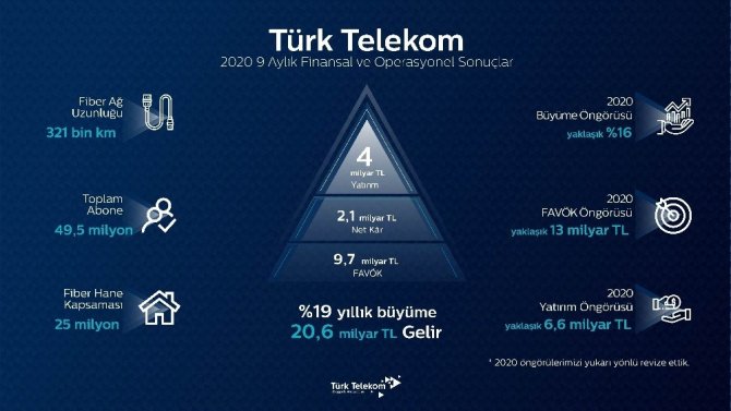 Yaşanan kontrollü normalleşmenin piyasalara olumlu etkisini 9 aylık performanslarına güçlü bir şekilde yansıttıklarını ifade eden Önal, “2020’nin ilk 9 ayındaki finansal performansımız ve son çeyrek görünümü, 2020 öngörümüzü yukarı yönlü revize edebileceğimiz bir ortam oluşturdu. Buna bağlı olarak, 2020 yılı için yıllık yaklaşık yüzde 16 gelir büyümesi, yaklaşık 13 milyar TL FAVÖK ve yaklaşık 6,6 milyar TL yatırım öngörüyoruz” dedi.