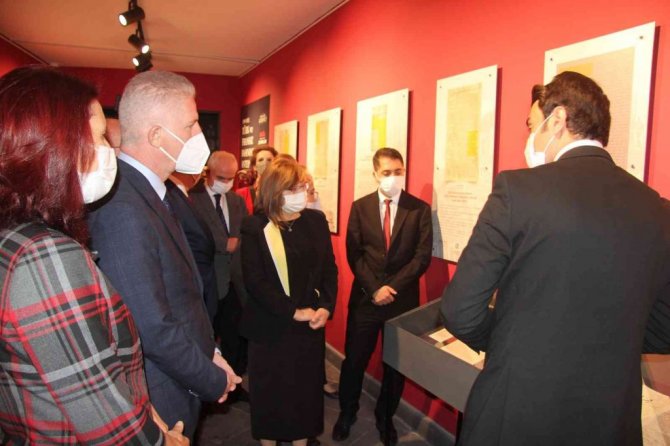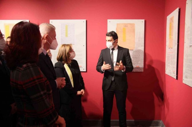 Açılışından ardından Müze Müdürü Murat Dağ, protokol üyelerine sergiyi gezdirdi.