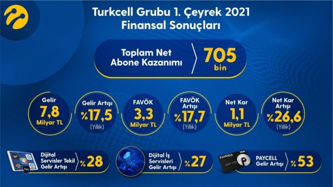 Turkcell Grubu, 2021 yılının ilk üç ayında geçen yılın aynı dönemine kıyasla yüzde 17,5 artışla 7,8 milyar TL gelir elde etti. Grup bazında FAVÖK 3,3 milyar TL'ye ulaşırken, şirketin FAVÖK marjı yüzde 42,2 olarak gerçekleşti. 2021 yılının ilk çeyreğinde 705 bin yeni müşteri kazanan Turkcell, son 3 yılın en yüksek çeyreklik müşteri kazanımını sağladı. Böylece her yıl1 milyon yeni abone hedefinin yüzde 70'ineisesadece ilk 3 ayda ulaşmış oldu.