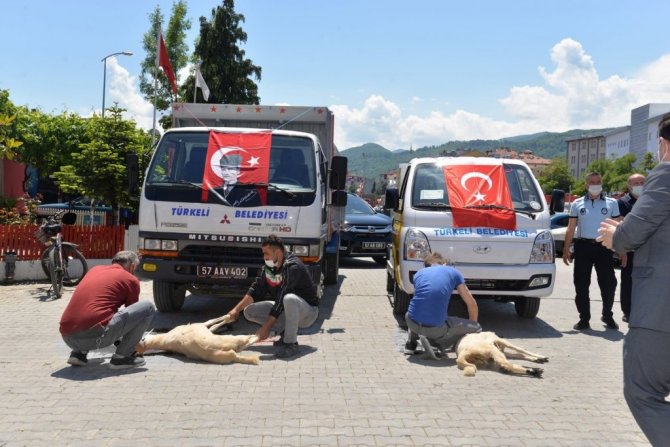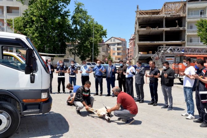 İlçedeki çöplerin toplanmasında kullanılacak olan 2021 model fabrika çıkışlı Hyundai marka Çöp Taksi ve lojistik faaliyetlerin yürütülmesinde kullanılan Mitsubishi marka kamyonet olmak üzere 2 adet araç için kurban kesildi ve dua edildi.