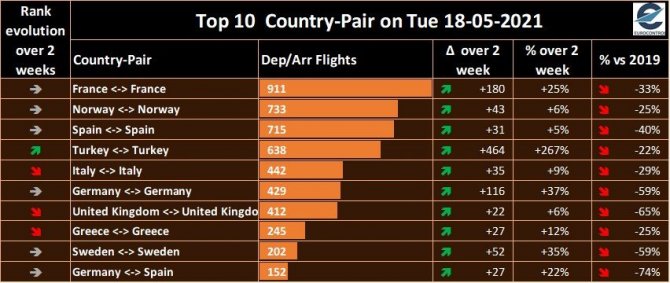 Öte yandan uçuş sayısı bakımında aynı gün Fransa 911 uçuşla birinci, Norveç 733 uçuşla ikinci, İspanya 715 uçuşla üçüncü, 638 uçuşla Türkiye ise dördüncü sırada yer aldı.