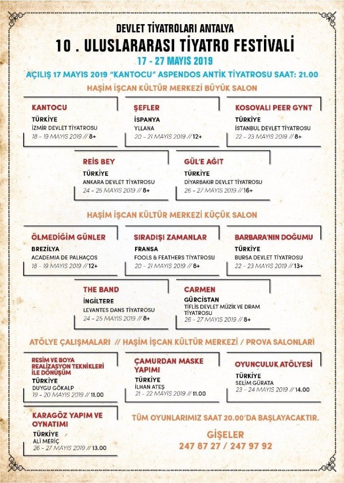 Antalya Valiliğince ilan edilen ’2019 Aspendos Yılı’ etkinlikleri kapsamında antik tiyatronun yaklaşık 2 bin yıllık tarihi atmosferinde tiyatroseverlere merhaba diyecek ’10. Antalya Uluslararası Tiyatro Festivali’ açılışın ardından Haşim İşcan Kültür Merkezi’nde sahnelenecek seçkin eserler ve atölye çalışmalarıyla devam edecek. Festival 27 Mayıs’ta sona erecek.