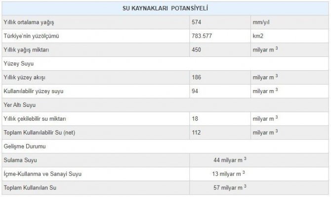 Dünya üzerindeki 35 milyon kilometreküp tatlı suyun sadece yüzde 0,3'ünün ekosistem ve insani tüketime uygun tatlı su kaynaklarından oluştuğunu anlatan Prof. Dr. Adem Aksoy, "Türkiye'de ise toplam 95 milyar metreküp yüzey suyundan yüzde 9 oranında faydalanılmakta olup, bunun yüzde 79'u sulamada, yüzde 14'ü içme suyunda, yüzde 10'u ise sanayide kullanılmaktadır. Türkiye, sanılanın aksine su kıtlığı sınırında bir ülkedir. Türkiye'nin gereksinim duyacağı su miktarının, önümüzdeki 25 yılda günümüz su tüketiminin 3 katı olacağı öngörülmektedir. Bugünün teknik ve ekonomik koşulları doğrultusunda, farklı maksatlar için kullanılabilecek yerüstü suyu potansiyeli yurt içindeki akarsulardan 95 milyar m, komşu ülkelerden yurdumuza gelen akarsulardan 3 milyar metreküp olmak üzere, ortalama yıllık toplam 98 milyar metreküptür. 14 milyar metreküp civarında tespit edilen yeraltı suyu potansiyeli ile beraber ülkemizin kullanılabilir yerüstü ve yeraltı su potansiyeli yıllık toplam 112 milyar metreküp olup, bu miktarın sadece 44 milyar metreküpü kullanılmaktadır. Türkiye'de kişi başına kullanılabilir su miktarı yıllık 1.300 metreküptür (günde yaklaşık 216 litre). Suyun değeri ve korunması söz konusu olduğunda, daha ziyade fazla su harcamamak, musluktan akan suyu verimli kullanmak, yağış miktarları ve küresel iklim değişikliği gibi konular göz önünde bulundurulmaktadır. Ancak suyu doğru ve verimli kullanmanın yanı sıra bir ürünün üretimi aşamasında ne kadar su kullanıldığı da bilinmekle birlikte çoğu zaman dikkate alınmamaktadır. Bu anlamda su yalnızca doğrudan değil dolaylı olarak da fazla tüketilmektedir. Üreticilerin ve tüketicilerin kullandığı doğrudan ve dolaylı tüm su, "sanal su" olarak tanımlanır. Diğer bir ifadeyle bireyin, topluluğun ya da sektörün su ayak izi, "birey veya topluluk tarafından tüketilen ve sektör tarafından da üretilen her mal ve hizmetin üretilmesi için gereken toplam tatlı su hacmidir." Su ayak izi de hesaba katıldığında ülkemizde bir kişinin kullandığı su miktarı günde gerçekte 5.416 litreye kadar çıkmaktadır. İklim şartlarının değişmemesinin mümkün olduğu durumda bile, yalnızca nüfus artışı sebebiyle 2050 yılında Türkiye'de kişi başına düşen su miktarının yılda 1.200 metreküp civarında olacağı öngörülmektedir Bir başka ifade ile ikliminin değiştiği ve nüfusunun hızla arttığı dikkate alındığında Türkiye'nin 2050 yılında su fakiri bir ülke olacağı öngörülmektedir. Benzer şekilde SYGM (2016) raporuna göre MPI-ESM-MR Modeli RCP8.5 Senaryosu Türkiye'nin yüzeysel su potansiyelini 98 milyar metreküp (yaklaşık yüzde 88) ve yeraltı suyu potansiyeli 14 milyar metreküp (yaklaşık yüzde 12) olarak hesaplamaktadır. Böylece günümüzde Türkiye'de kullanılabilir su miktarı kişi başına yıllık 1.300 metreküp civarında olduğundan, Türkiye bu miktara kıyasla su azlığı yaşayan bir ülke konumundadır. Ülkemizde sektörlere göre 2012 yılında gerçekleşen ve 2023 yılında beklenen su tüketimi miktarları ve yüzdeleri dikkate alındığında bugün Türkiye'nin kullanıma uygun durumdaki yüzey ve yeraltı su potansiyeli yıllık toplamı olan 112 milyar m'lük suyun tamamı 2023 yılında mevcut ve tümüyle kullanılabilir durumda olmak zorundadır. Ancak bu miktarın tümünün kullanılamayacağı gibi küresel iklim değişikliği etkisiyle ülkemiz genelinde azalan yağış ile ülkemizin tüketilebilir yerüstü ve yeraltı su potansiyelinde önemli azalmalar olmaya başlamış ve bu azalma gelecekte de devam edecektir.