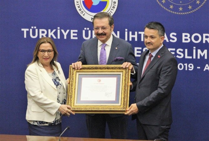 Programın sonunda ‘Ürün İhtisas Borsası Faaliyet İzin Belgesi’ni Ticaret Bakanı Ruhsar Pekcan’dan teslim alan Hisarcıklıoğlu, Pekcan’ın izniyle izin belgesini Türkiye Ürün İhtisas Borsası Genel Müdürü Ali Kırali’ye verdi.