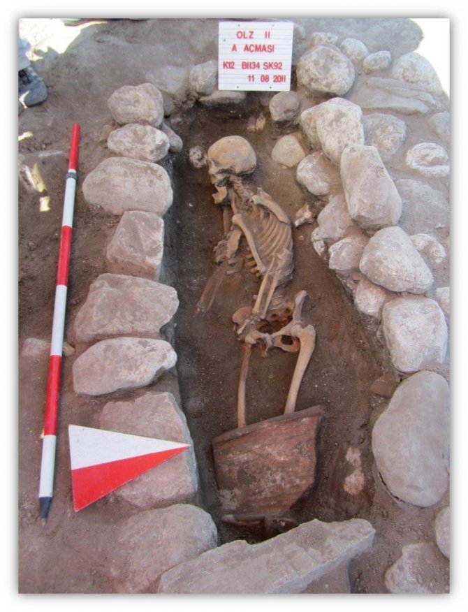 Türklere Anadolu'nun kapılarını açan 1071 Malazgirt Zaferi'nden yaklaşık 100 yıl önce gelen öncü Türklerin mezarlarının bulunduğu Oluz Höyük'te cep açarak defnedilen ölülerin ayaklarının üstüne bir cisim konulduğunu belirlediklerini anlatan Oluz Höyük Kazı Başkanı İstanbul Üniversitesi Öğretim Üyesi Prof. Dr. Şevket Dönmez, "Orta Asya'daki Suttuu-Bulak Mezarlığında Oluz Höyük mezarları ile aynı geleneklerle gömülmüş ve aynı yüzyıllarda defnedilmiş bireylere rastladık" dedi.