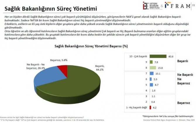 Araştırmada bu süreçte en fazla takip edilen mecranın TV, en fazla takip edilen kaynağın da Sağlık Bakanlığı açıklamaları olduğu belirlendi. Araştırmanın kesin bulgusu büyük çoğunluk tarafından (yüzde 64 ve yüzde 80) Sağlık Bakanlığı’nın bu süreci başarılı yönettiği yönünde fikir beyan etti. Başarılı yönettiğini düşünenler arasında erkek, evli ve 65 yaş üstü kişiler daha fazla olduğu görüldü.