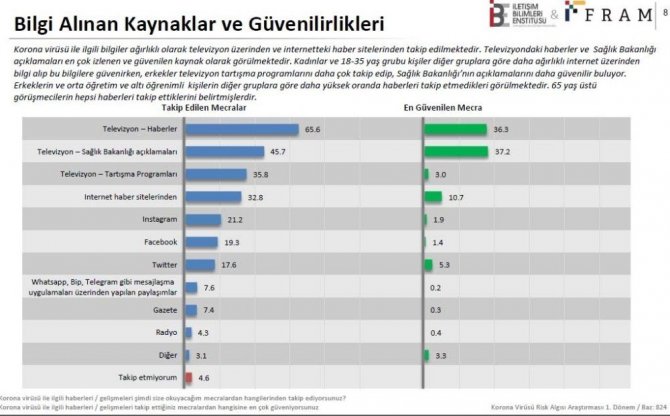 2019 yılı Aralık ayında Çin’in Wuhan şehrinde tespit edilen yeni Korona virüs (Covid-19) hastalığı, Çin sınırlarını aşarak dünya genelinde yayılmaya başladı. Dünya Sağlık Örgütü, 11 Mart’ta dünya çapında Korona virüs pandemisi, yani salgın ilan etti. İletişim Bilimleri Enstitüsü ve FRAM Araştırma, yeni tip Korona virüsün Türk toplumu üzerindeki izlerini ölçümlemek ve topluma faydalı iç görüler sağlayabilmek amacı araştırmada bulundu. Araştırmada Türkiye temsili kitlenin detaylı bir şekilde görüşlerini almak için, kantitatif araştırma tekniklerinden bilgisayar destekli telefon görüşmeleri (CATI) yöntemi uygulandığı belirtildi. Her bir görüşmenin ortalama 9 dakika sürdüğü ifade edildi. Araştırmada 26 bölgeden seçilen illerde, nüfusa orantılı şekilde dağıtıldığı 18-80 yaş arası 824 kişi ile görüşüldüğü açıklandı.